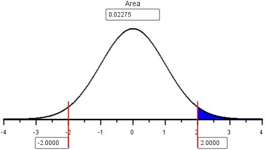 The area to the right of \(z = 2.00\) is \(0.02275\). This is the probability that the random sample of \(n = 4\) items will have a mean that is greater than \(10\).