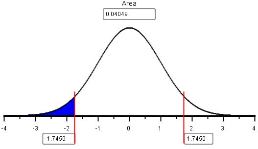 The area to the left of \(z= -1.745\) is \(0.04049\). This is the probability that the mean costs for the \(n = 40\) weeks will be less than $20,000.