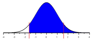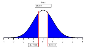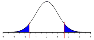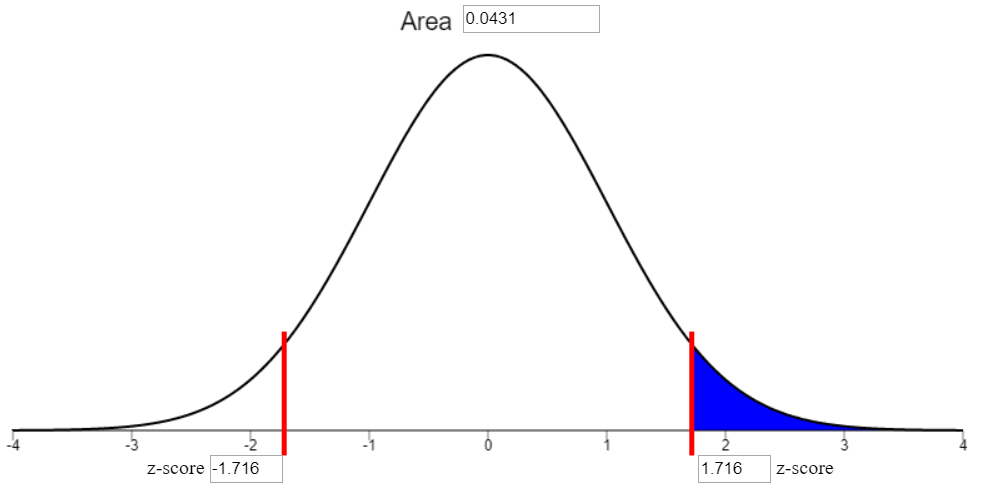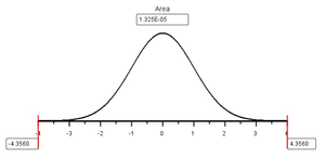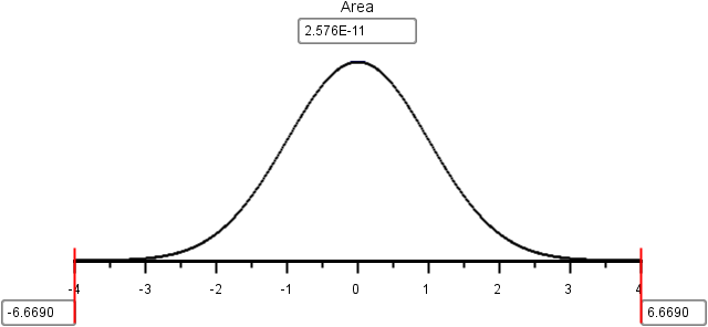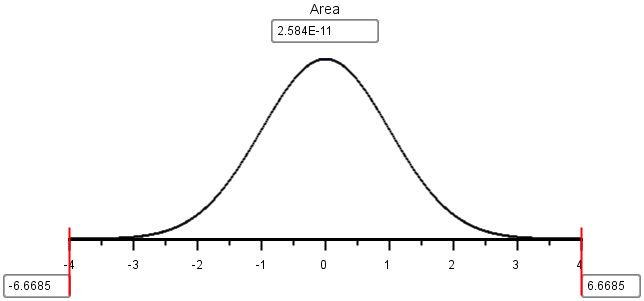 Using the applet, we shade the area in both tails and then type in the value of \(z=-6.669\). The applet reports an area of “2.584E-11.” This is the way computers indicate scientific notation. Expressed using more traditional notation, we get