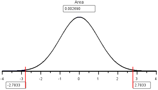 The \(P\)-value is determined using the alternative hypothesis. If the alternative hypothesis is two-sided (i.e. if the alternative hypothesis involves \(\ne\),) then the \(P\)-value is the area in the tails further than \(\pm z\). That is, it is the area to the left of \(z=-6.669\) plus the area to the right of \(z=+6.669\).