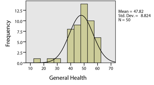 A group of researchers led by Dr. Jared Bunch studied the long-term effects suffered by patients who experienced a cardiac arrest outside a hospital. The long-term health of the patients was assessed using the Short-Form General Health Survey (SF-36) at the time of their last follow up visit. The SF-36 is normalized so the mean score in the general population is \(\mu=50\) and the standard deviation is \(\sigma=10\). The minimum score is 0 and the maximum score is 100. Lower scores on the SF-36 indicate a poorer quality of health.