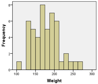 Next, we compute summary statistics. The sample size is \(n=48\), and the sample mean is \(\bar{x}=177.6\) pounds. According to the CDC, the standard deviation of the weights of individuals in the United States is \(\sigma=26.7\) pounds.