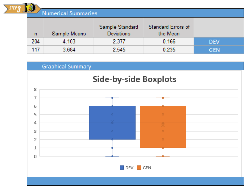 4.Based on the summary statistics (means, standard deviations, and sample sizes) for the two groups, does the true mean number of nights each week that the children engage in reading seem to differ significantly between the DEV and GEN groups?