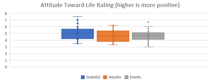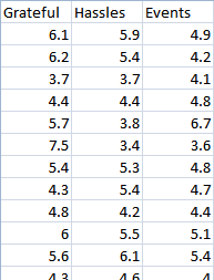 Data representative of the values reported by Emmons and McCullough are given in the file Gratitude.xlsx. The data is divided up into three columns which represent Grateful, Hassels, and Events.