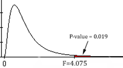 This can be found in the output. Our test statistic, \(F\), is: \[F = 4.075\]