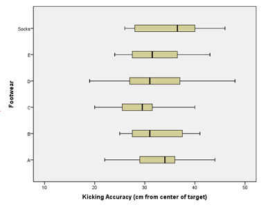 Nike, a company that makes sporting goods including shoes, funded a study to compare five soccer shoe designs. The objective of the research was to determine if there is a difference in the mean accuracy soccer players achieve using different Nike shoe designs.