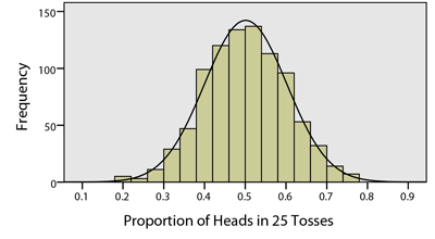 Answer the following questions. Consider exercise 1, in which you tossed a coin \(n=25\) times and recorded the proportion of heads.
