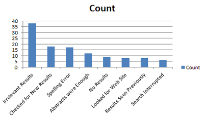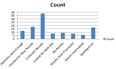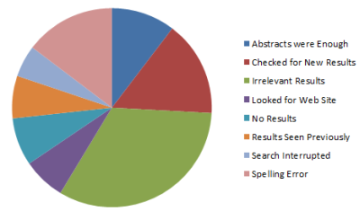 We conclude that the main reason that people do not click on any of the search results is that the results were not relevant. The next two most common reasons were that they did not find any new results or they made a spelling error in their search query.