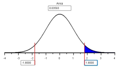 Next, we enter the \(z\)-score (1.800) in the Normal Probability Applet and shade the area to the right of this value.