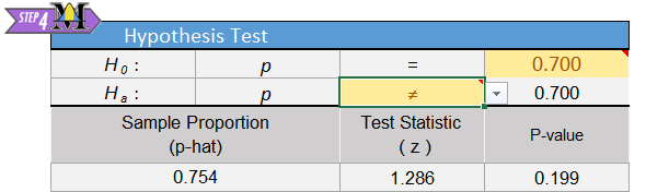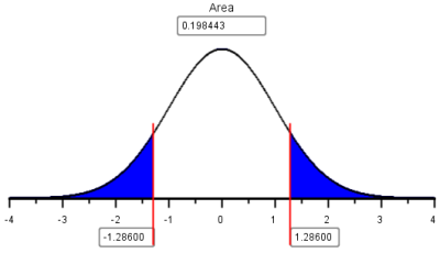 Remember, we assume that the null hypothesis is true, so we use the value given in the null hypothesis for \(p\). Using the NormalApplet, you can find the \(P\)-value. This is a two-tailed test, since the alternative hypothesis includes both values above 0.70 and below 0.70. In the applet, make sure both tails are shaded, then enter the \(z\)-score of 1.286.