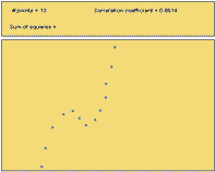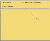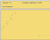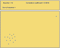 An outlier is any point that is very far from the others. Each of the following scatterplots shows data where there is one outlier present. Notice how one point can influence the correlation coefficient. Imagining that the outlier was removed from each of the following plots, estimate the correlation coefficient in your mind. Compare that value to the specified correlation coefficient with the outlier included.