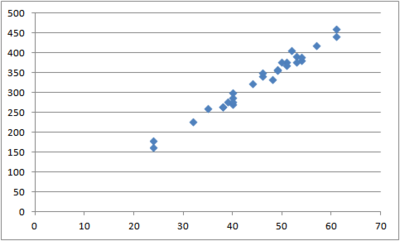 In the scatterplot, we see a cloud of data. Even though there is a considerable amount of variability in the data, the points tend to follow a line. If you squint with your eyes, you might imagine that the data look like a fat hot dog.