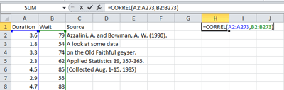 Using any cell in an excel page you can calculate the Correlation coefficient. The command is = CORREL (array 1, array2). For array 1 highlight the explanatory variable (x) and for array 2 highlight the response variable (y). Here is a screen shot example of finding the correlation coefficient of the Old Faithful data.