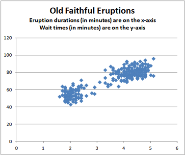 For the Old Faithful data, we plot the eruption duration on the \(X\)-axis and the waiting time before the next eruption on the \(Y\)-axis of a scatterplot.