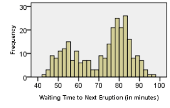 There appear to be two peaks in the histogram representing the waiting times. This bimodal distribution is curious. Why should there be a bimodal distribution in the duration of the eruptions? Could there be a relationship between the length of an eruption and the waiting time until the next eruption?