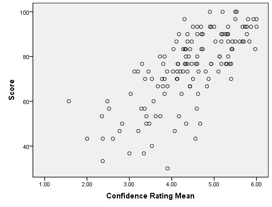 For each student, the mean confidence rating was computed. This mean confidence rating and their score on the exam (out of 100 points) are given in the file MathSelfEfficacy.xlsx.