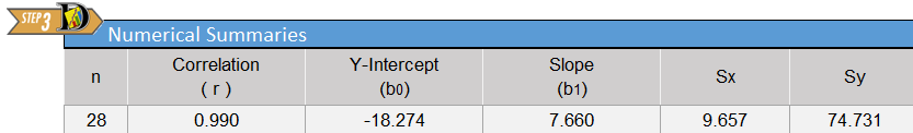 The regression coefficients are given in the columns labeled “Y-intercept (\(b_0\))” and “Slope (\(b_1\))”. The y-intercept gives the constant term (or the term that is not multiplied by \(x\)) which is the value of \(b_0\). In this case, \(b_0=-18.274\). The “Slope” entry of the table gives the value that is to be multiplied by \(X\); this is the slope of the regression equation. In our model, \(X\) represents the head length, in centimeters. The slope in our regression equation is \(b_1=7.660\). Putting all this together, we get the equation: