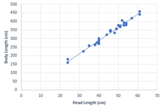 We will use Sereno and Barr’s measurements on the lengths of Estuarine, or saltwater, Crocodiles’ heads to estimate the length of their bodies. Their measurements are given in the file EstuarineCrocodiles(Modified).xlsx. In the previous reading assignment, we created a scatterplot for these data. We saw that there is a strong positive linear relationship between these two measurements. In this lesson, we will fit a line to the data. This line can be used to predict the length of a crocodile with a known head length. In particular, we will use this line to estimate the length of SuperCroc.