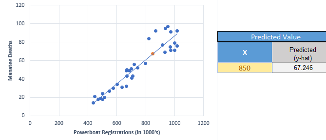 Note that if there are 850 thousand powerboats registered, then the regression equation suggests that there will be an estimated 67.246 manatees killed. Of course, we cannot kill a fraction of a manatee. However, when making predictions, it is appropriate to leave the prediction as a decimal. This is a predicted value, and it does not actually have to be attainable.